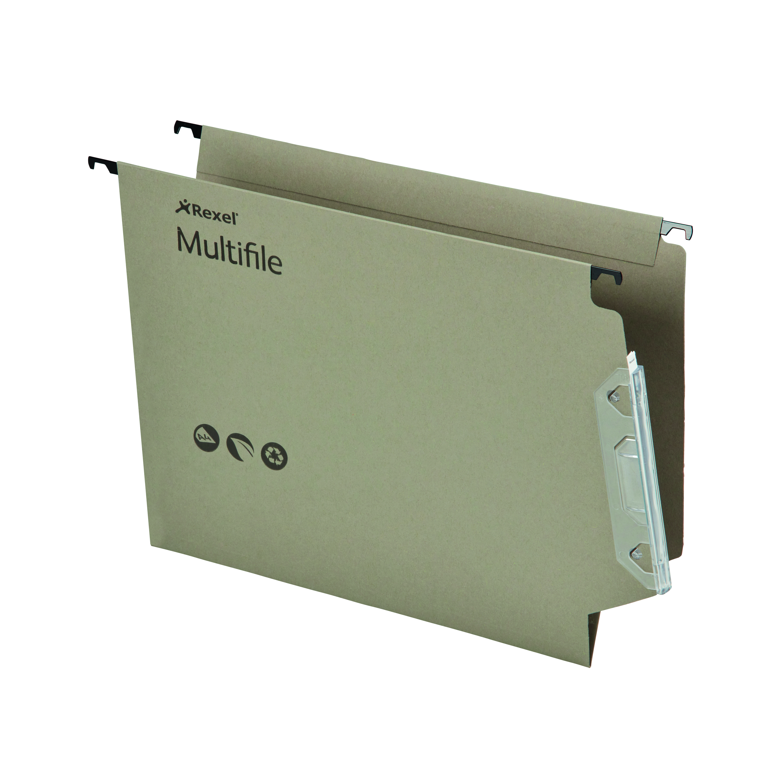 Rexel Multifile 330 Lateral Suspension Files are the perfect way to store and protect your documents. The files are made from 100% recycled manilla, keeping your documents neat, safe and secure. Each suspension file has a 15mm capacity for up to 150 sheets of A4 paper. They are also supplied with plastic tabs to link files, as well as printable card inserts for the tabs. This pack contains 50 green files.